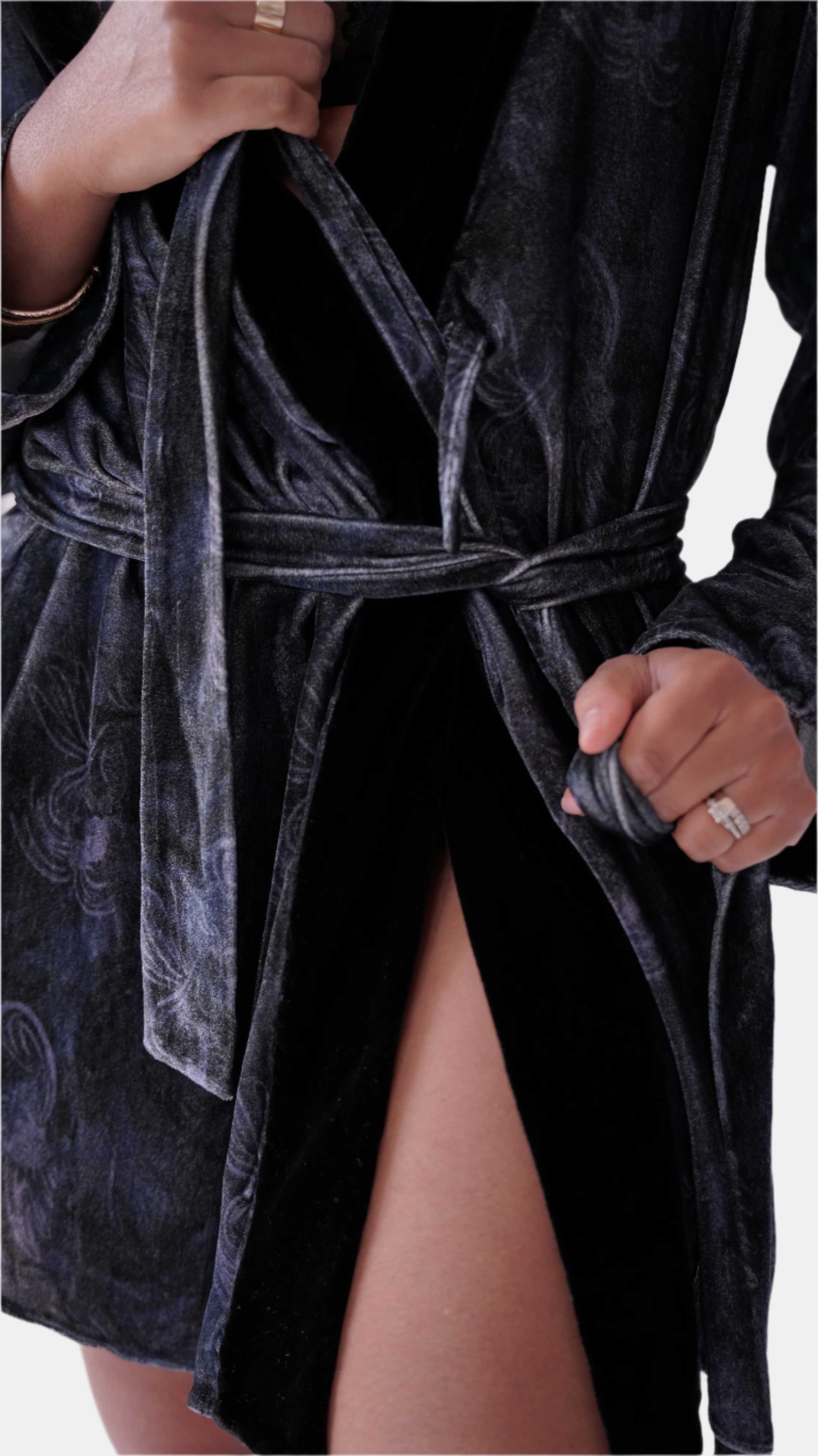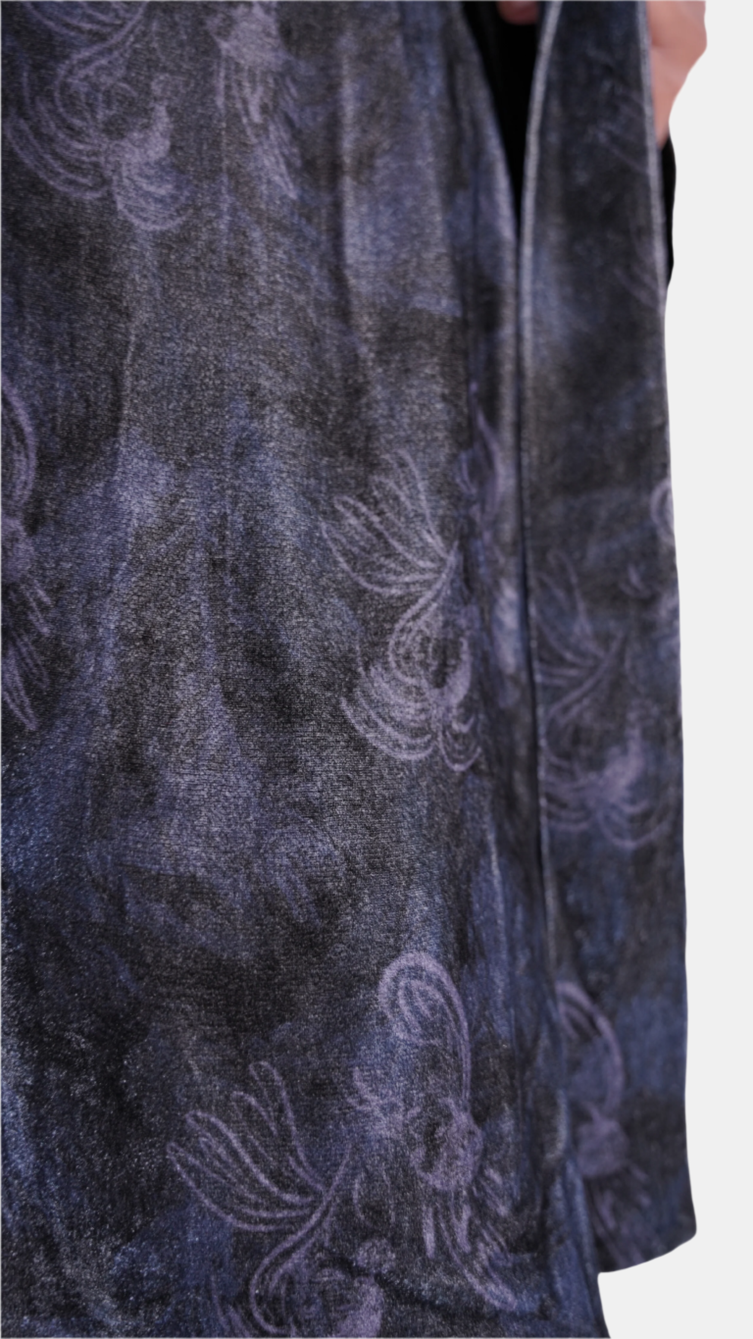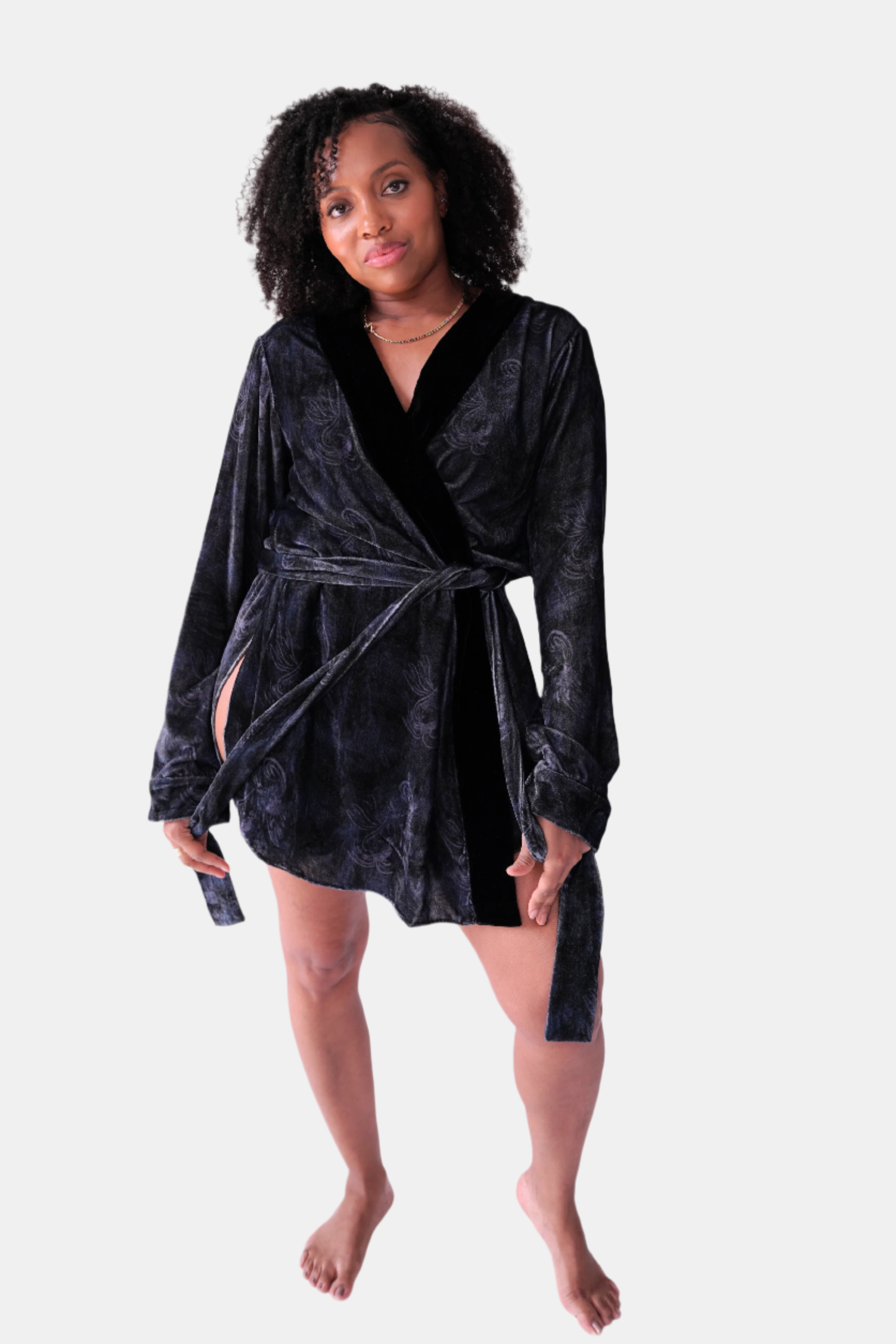 our short robe can be worn as a duster or a robe, with high slits at either side for easy access to pockets