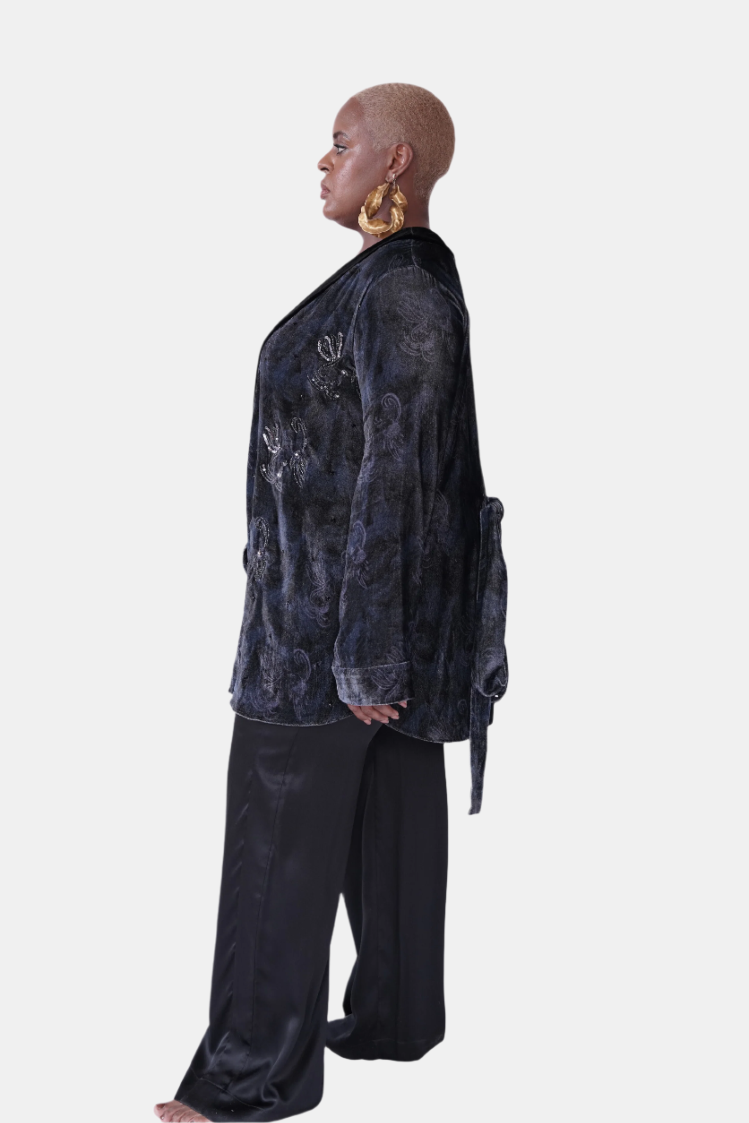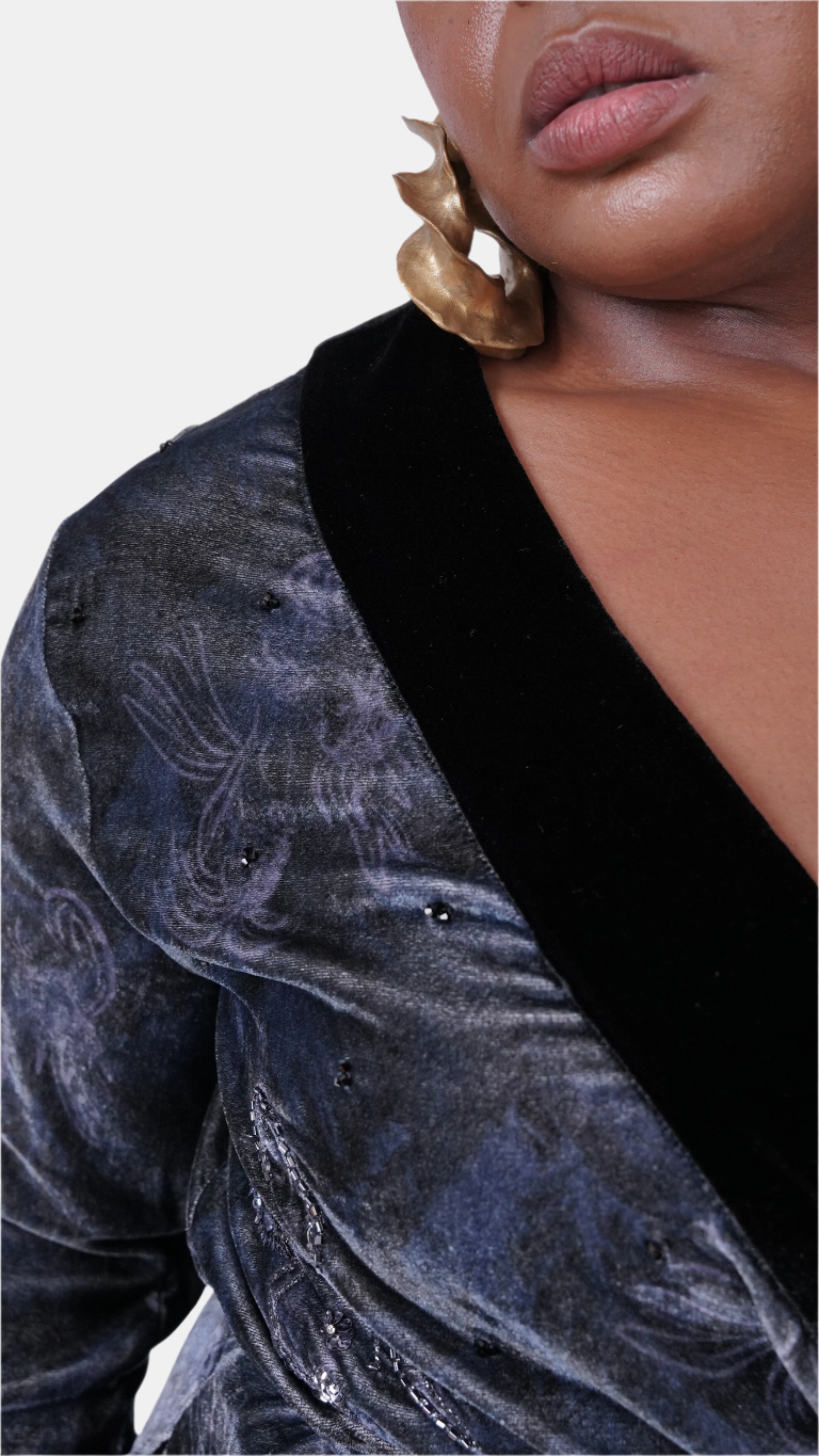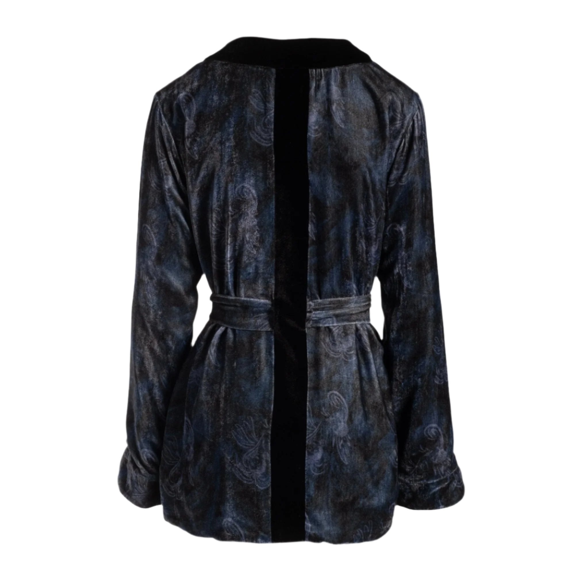 this silk velvet smoking jacket in our exclusive perle noire print is a stunning homage to josephine baker’s elegance