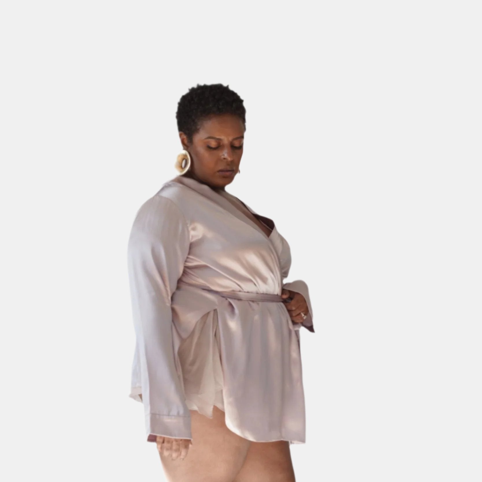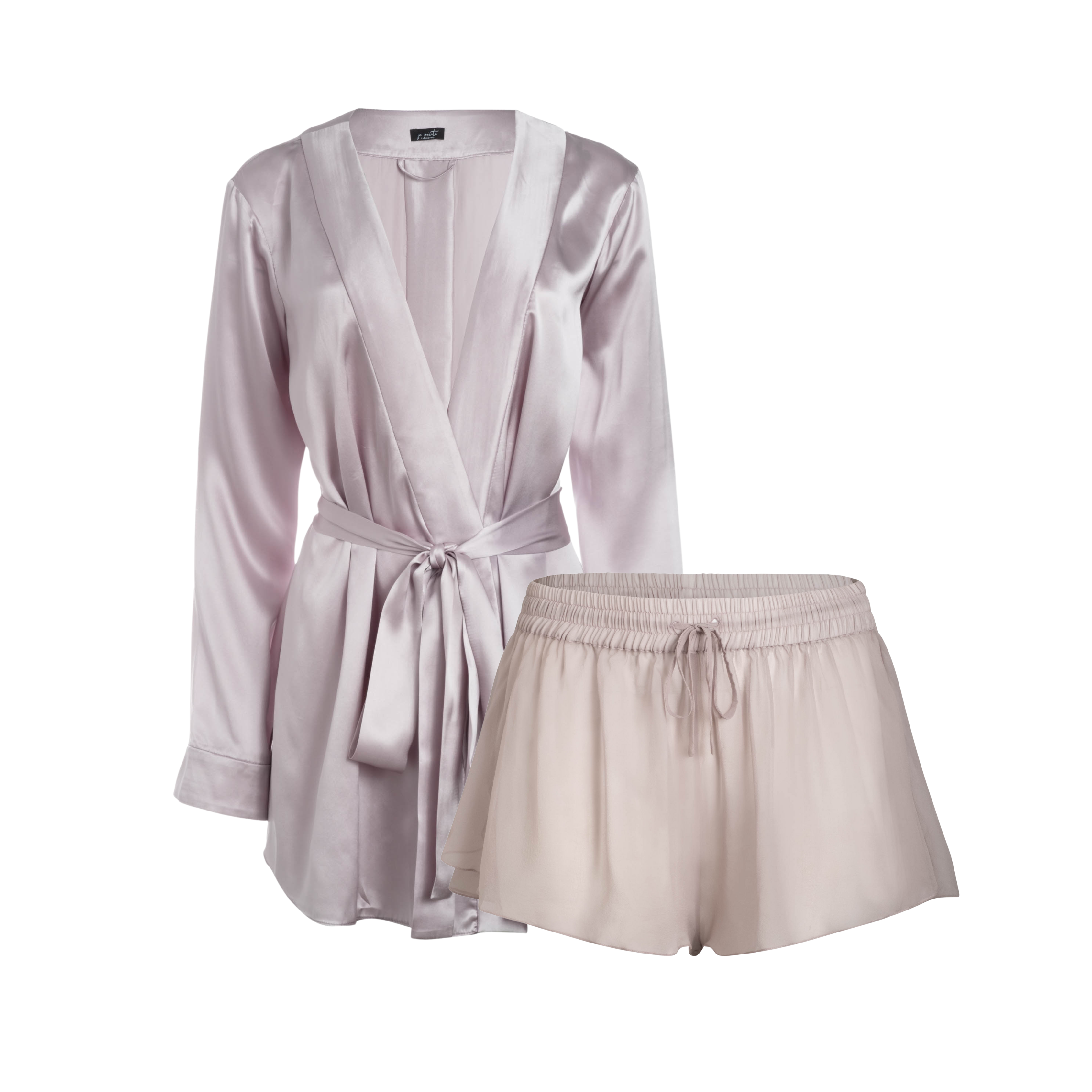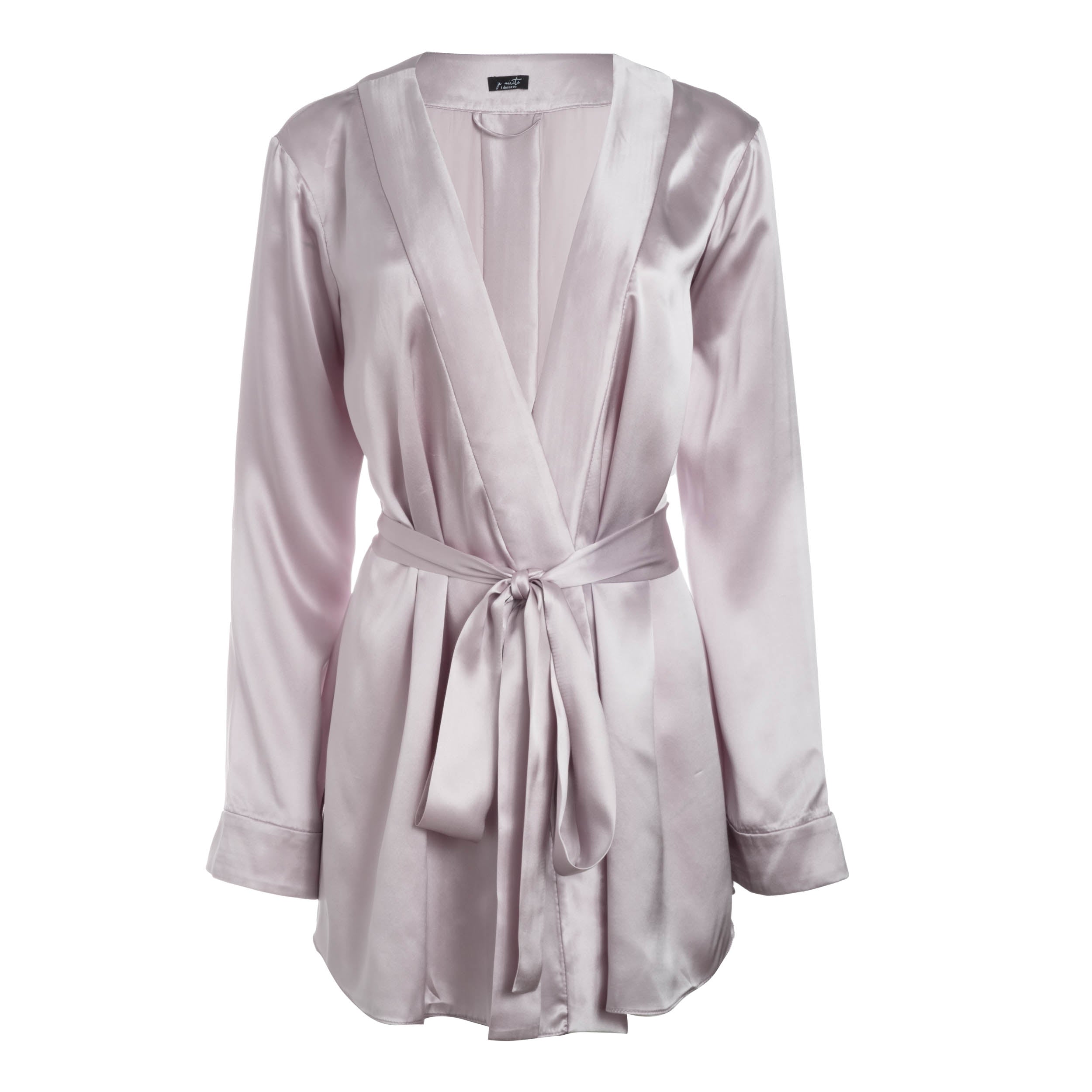 this sumptuous short robe, crafted from luxurious silk in a delicate blush hue, exudes femininity and grace