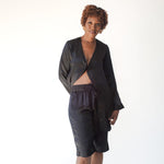 this sophisticated ensemble combines the effortless style of a silk shirtdress with chic bermuda shorts